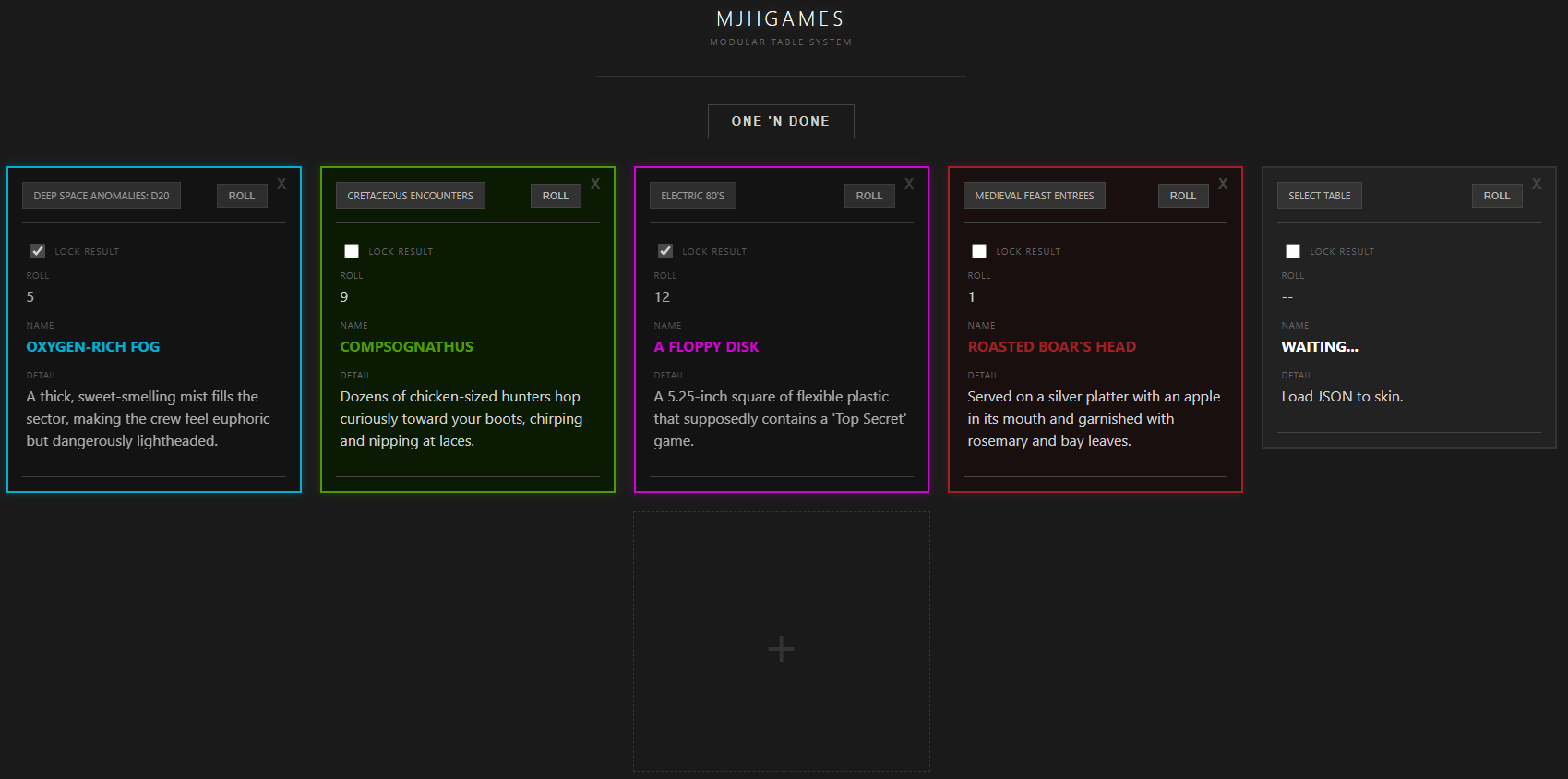 The Modular Table System is built to grow with your campaign. We provide the schema; you provide the imagination. Whether you're building a massive 100-item loot table or a 6-item "Atmospheric Weather" roll, the system treats your custom creations with the same professional polish as the official mjhGames modules.